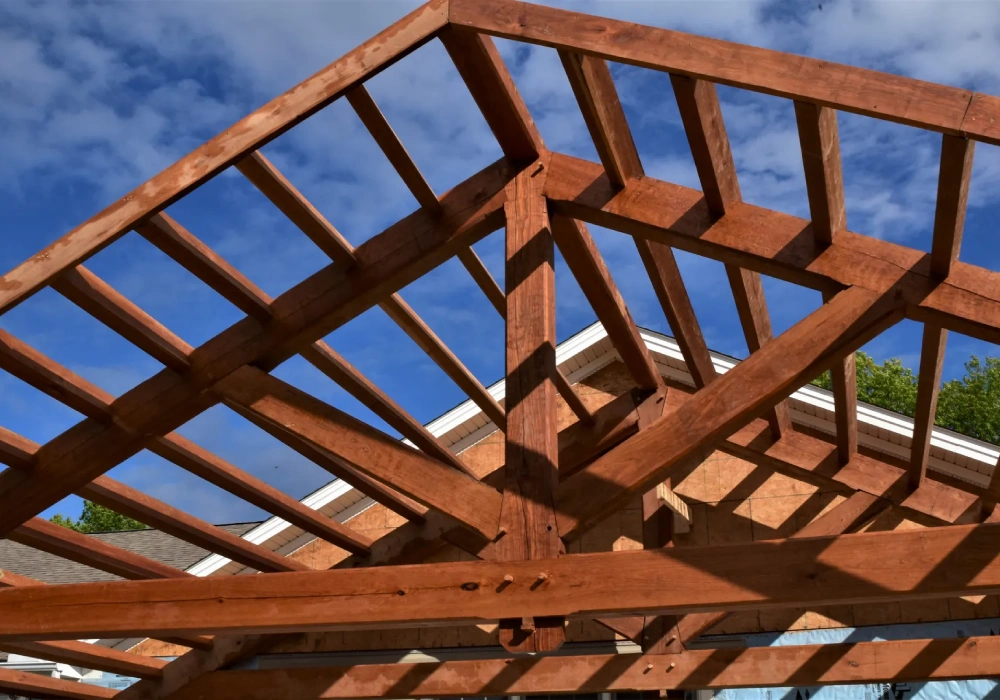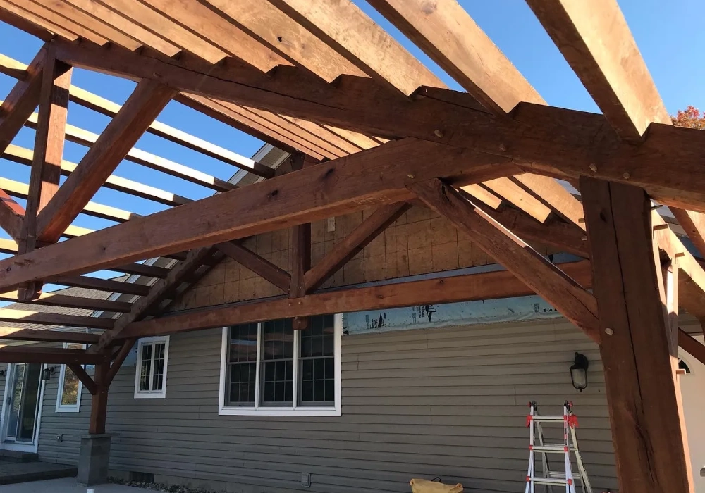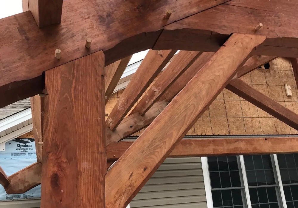 Leading into the great room addition is a 10′ x 12′ covered entryway that is open on the sides and framed with rot-resistant, beautiful black cherry timbers. This entryway also features a roof system of decorative kingpost trusses, and the four posts are once again joined with the top plates and tie beams with traditional English Tying Joints. The clients wanted to maintain a rustic look throughout the framework, and opted to leave all timbers with their original rough-sawn appearance.