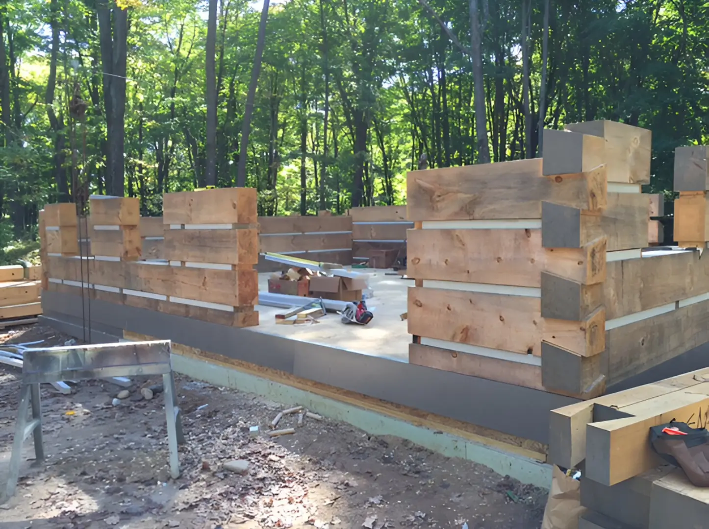My first dovetailed log structure in the summer of 2015. I’ve had such a strong interest in dovetail log building for many years, and this summer I finally got the opportunity to build one, to craft the log joinery and then do a trial assembly of the log walls in my yard. This 20′ x 26′ lakeside cabin will sport a partial wrap-around porch (owner-built), and a 13′ x 20′ timber framed loft. The client chose to forego a heavy timbered roof system and instead will have a conventionally framed roof. This project also featured massive 8″ x 12″ eastern white pine wall logs, (with a few of the longer ones sawn from hemlock), with handcrafted dovetail joinery locking the walls together. On the inside of all corner notches are Emseal gaskets, placed in a hidden vertical groove, preventing any air infiltration. Octagonal wall-alignment pins, cut from air-dried (10 yrs) oak planks, 1-1/4″ in diameter and 20″ long, are placed at approximately 4′ intervals along the log walls. These stout pins provide lateral stability to short wall sections and aid in keeping long courses in line.