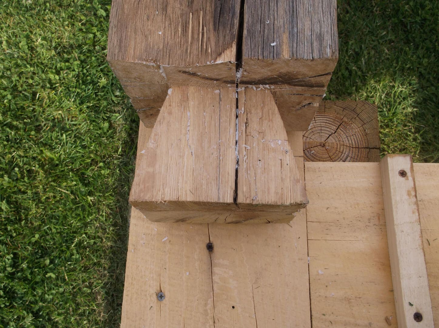 The eight 8″ x 12″ wall-posts exhibit English Tying Joints, with the historically proven variant of this joint (a “cog” instead of a lap dovetail; see photo’s below) locking the top of the wall plates with the underside of the tie beams.