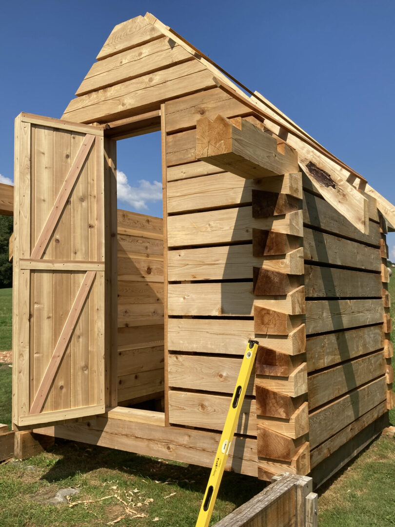 This little 8′ x 8′ log sauna house was crafted with high insulation in mind, so 8″ thick red cedar wall logs were used. Due to the high interior temps that will be generated, synthetic chinking on the interior would not have worked. So, each interior chink space was custom-fitted with “chinkboards” that covered the chink gap and each gap will be fitted with rockwool insulation, moisture resistant and able to withstand the high interior temps. The door was also constructed of western red cedar and is 5″ thick and filled with 4″ of rockwool insulation. As always in my frames, traditional timber joinery was employed, here in the roof timbers with step-lap rafter seats & pegged ‘tongue/fork” at the peak. Pictured is the pre-assembly I did in my yard to ensure all joinery fit properly, as the owner will be assembling the structure in the spring of 2022.Click on any photo below for an enlarged image
