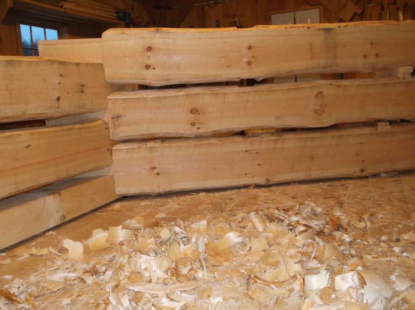 The pictures of the log cabin shown below illustrate much of the hand-tool crafting of the log joinery, the daily goings-on that take place in my shop, and also the trial assembly I did here in my yard. The client, Tim Ebert, will be erecting the structure himself, doing all the chinking, and also the vast majority of all finish work.
