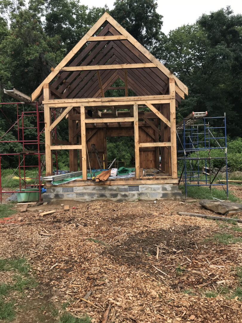 A very special mention goes to Gary Clower, of Vienna, Ohio, who was the principal designer of the framework, produced great shop-drawings for me to work from, and then gave so freely of his time during those hot days of frame pre-assembly and then the raising. Also, a big thanks to John & Sarah Woodall for their generous time-contribution and tremendous help on raising day. This beautiful frame could not have been “born” without you all!!